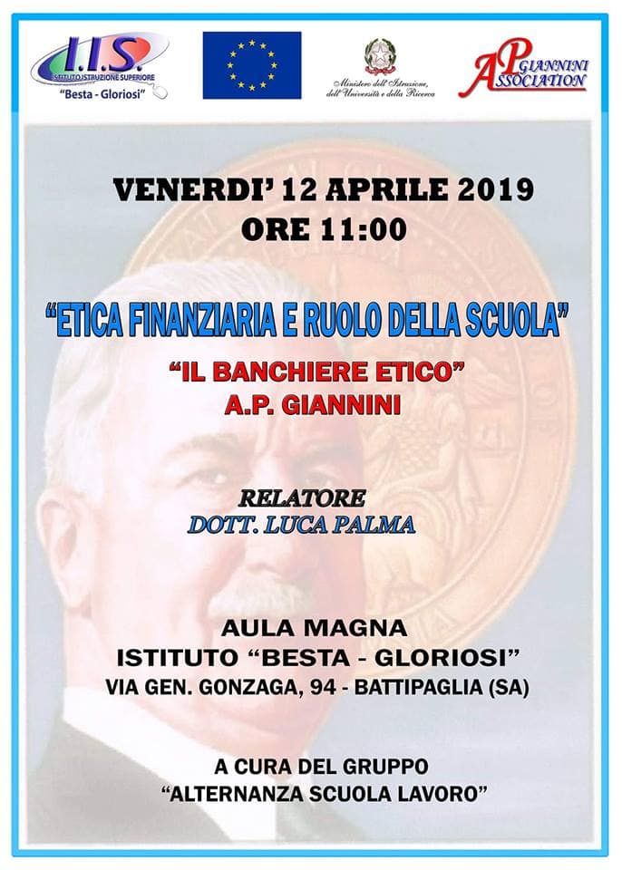 Battipaglia – L’Istituto Istruzione Superiore “Besta-Gloriosi” ha aperto le porte al banchiere Amadeo Peter Giannini, attraverso il convegno a lui dedicato sull’etica finanziaria. Promosso dal Dott. Luca Palma, economista ebolitano e presidente dell’A.P. Giannini Association, al fine di far conoscere ai ragazzi dell’istituto tale figura, quale esempio da seguire e far crescere sempre più l’importanza dell’etica nel sistema economico-finanziario. Difatti, la scuola riveste un ruolo importante affinché si possano riscoprire con essa, fra i banchi, tra i giovani tali valori, oramai alla deriva. Così il Dott. Luca Palma ha ricordato le gesta, attraverso il racconto della storia, presentata come un film che ha dell’incredibile, del Giannini figlio di due emigranti liguri, che in soli quarant’anni creò la banca più grande del mondo, gettando le fondamenta della “Bank of Italy” nell’ottobre del 1904, in un bar di San Francisco, definita dai grandi banchieri della città la “Little Bank”. Ma questa banca era diversa, rivolgeva i propri servizi alle persone più bisognose: operai ed emigranti di ogni razza e religione, attingevano ai fondi della banca, e le uniche garanzie che richieste erano i calli sulle mani e le rughe sul viso. Durante il nefasto terremoto del 18 aprile 1906, l’italo-americano Giannini infuse la speranza tra la gente di San Francisco, riaprendo le attività dopo solo sei giorni, mentre le altre banche avevano ancora chiusi i propri caveau. Egli fece quello che nessuno aveva mai tentato, diede vita anche ai “Sogni” più reconditi di attori e registi del Cinema, che un giorno sarebbero diventati personaggi internazionali. Grazie al suo sostegno presero vita “IL MONELLO” di Charlie Chaplin, “BIANCANEVE E I SETTE NANI” di Walt Disney, “ACCADDE UNA NOTTE” di Frank Capra, veri e propri capolavori. Dal suo genio vennero alla luce la Bank of America, la Banca d’America e d’Italia e la Transamerica, inoltre finanziò il Golden Gate il Piano Marshall e molte inestimabili pellicole di Hollywood come “Via col Vento”. Alla fine del convegno il Dott. Luca Di Palma ha mostrato documenti ed oggetti storici della Banca d’America e d’Italia di Battipaglia, ringraziando la dirigente scolastica Dott.ssa Silvana D’Aiutolo ed il gruppo “Alternanza Scuola-Lavoro” per l’opportunità concessa, quale presidente dell’A.P. Giannini Association, per aver contribuito alla diffusione e alla conoscenza di tale figura tanto sconosciuta in Italia quanto tanto famosa ed apprezzata negli Stati Uniti.