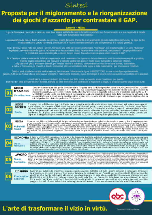 Già nel 1999 fu presentata dal C.R.N. Associazione, la proposta ai precedenti Governi, per aumentare le poste inique sui giochi ed in particolar modo su quello del Lotto. Di fatti furono aumentate le vincite per il Terno, la Quaterna e la Cinquina, ma non per l’ambo e l’ambata. L’associazione CRN Centro di Ricerche di Numerologia ha presentato una nuova modifica di miglioramento, portandola all’attenzione del Governo attraverso due figure importanti del nostro territorio, la senatrice Felicia Gaudiano ed il Senatore Francesco Castiello del movimento cinque stelle. La proposta presentata è racchiusa in sei punti ben precisi con svariati obiettivi per scopi migliorativi e di prevenzione, nel delicato mondo dei giochi d’azzardo, per tutelare minori, soggetti vulnerabili ed il popolo degli scommettitori. E’ necessario fare alcuni passi indietro della nostra storia, andando nel 1727 ove lo Stato Pontificio, allo scopo di evitare l’impoverimento delle famiglie, adottò la probabilità per giustificare il Gioco d’Azzardo, con l’equità, cancellando la scomunica verso tutti i giocatori redatta da Benedetto XIII, al fine di migliorare l’economia di tutti e non solo quella del banco. Andando avanti nel tempo Il Decreto n. 1331 del 1816 di Ferdinando IV di Borbone venne emanato per aiutare i poveri con il gioco delle Zitelle (Gioco del Lotto), decreto sospeso con l’unità d’Italia. Ad oggi non risulta nulla di equo e pertanto tutti i giochi d’azzardo sarebbero dovuti scomparire già da tempo, poiché non rendendoli equi in base alla probabilità sul piano economico, sono diventati la causa della “ludopatia“. La proposta di fatto espone varie soluzioni ben documentate, per rendere equi i giochi la dove è possibile, in particolar modo quelli con tradizioni storico culturali, mentre ove non sarà possibile, necessita valutare costi e benefici ed abolirli quelli ingiusti e dannosi. Per gioco equo si intende un gioco che paga al vincitore la somma pari alla posta moltiplicata per l’inverso della probabilità vincente; Facciamo un esempio semplice con l’ambata al gioco del lotto, ovvero un solo numero su di una singola ruota, in questo caso, per 1 euro di posta giocato, dovrebbero essere pagati 18 € per un'”ambata” (estratto semplice), il giocatore che vince attualmente viene pagato per l’ambata 11.23 € lordi, a tale cifra deve essere detratta la tassa pari all’8% e poi il 12% per vincite più elevate. Questo per un semplice numero, di fatti l’iniquità” cresce al crescere della “difficoltà” del gioco, ambo, terno, quaterna, cinquina, in quanto il rapporto tra equità/vincita reale cresce con il crescere della “difficoltà”. Considerato che sulla vincita vi è una trattenuta, i valori di questi rapporti di iniquità diventano ancora più alti. Un altro punto è quello di rendere i premi milionari, più accettabili, sviluppando somme sempre consistenti, ma una maggiore fetta di fortunati. Di fatti i danni vengono anche vincendo molti soldi. Stabilire l’equità significa anche abbassare a 0.20 centesimi la quota minima di gioco per ogni schedina, eliminando quella minima da 1 Euro, fornendo al giocatore che desidera tentare la fortuna una spesa cinque volte inferiore nel rapporto di gioco incidendo molto meno sullo stato economico personale o familiare. La proposta contiene tante altre specifici miglioramenti come quello dell’ l’acculturamento, avvicinando gli individui al calcolo e alla matematica, in modo che i giocatori diventino più consapevoli, oltre ad avere una speranza più giusta, più equa e meno dannosa. L’informazione, la formazione è un tassello importante proposto dall’associazione C.R.N., che unito agli altri obiettivi descritti nei sei punti, possono contribuire a risolvere in modo significativo tale piaga, salvando “capre e cavoli”. L’attenta costruzione della proposta si è avvalsa della conclamata esperienza e preparazione dei ricercatori, svolta disinteressatamente da oltre trentacinque anni. ti articoli è stata evidenziata la facile ripetizione dei numeri, che costantemente emerge applicando la TDC (Teoria dei Codici), ma il tutto ci conduce ad una riflessione e ad una domanda più importante: “Le macchine che estraggono i numeri come funzionano? Le stesse funzionano bene? …. Forse è il caso che le estrazioni ritornano ad essere fatte dal vivo in diretta, come tante altre trasmissioni, considerato l’enorme giro di denaro che si porta dietro da secoli.